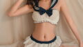 爽やかなブルーと白のコントラスト。 うっすら透ける肌にドキドキ☆ バスト部分はふんわりギャザーとリボンで、まるでお話の中のプリンセス。 アンダーバストから下は短冊状にカットされた生地がゆらゆら揺れて肌が見え隠れ。 軽く、柔らかな着心地です。